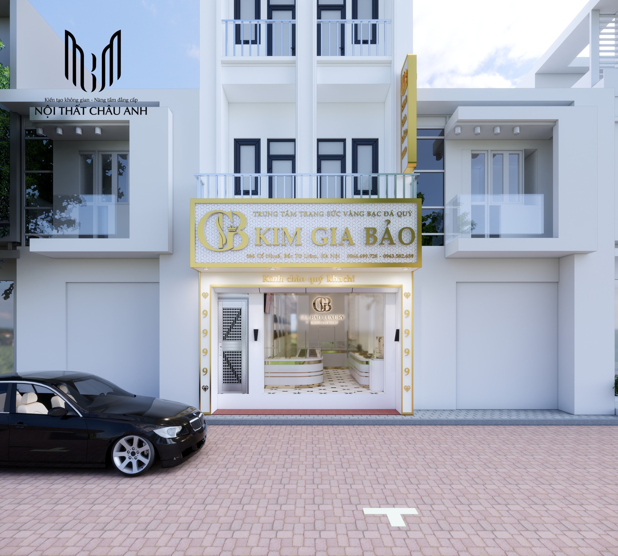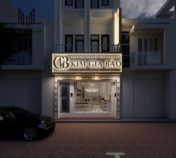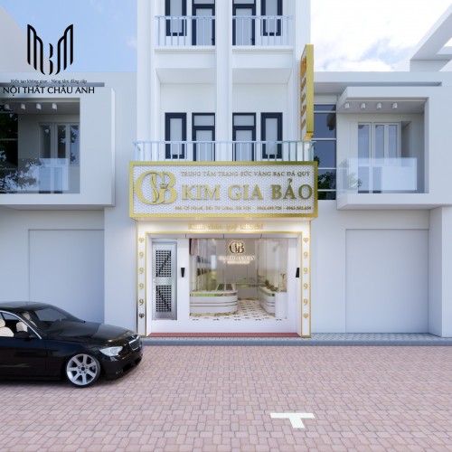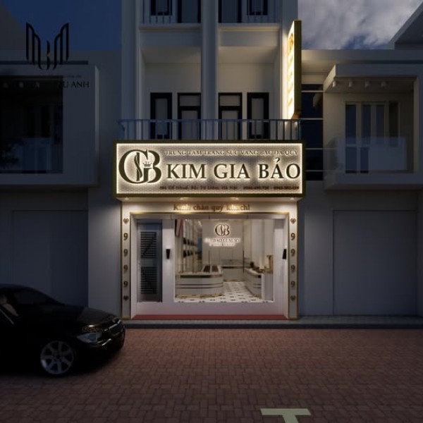 Ngay từ bên ngoài, tiệm vàng Kim Gia Bảo gây ấn tượng mạnh mẽ bởi mặt tiền sáng bừng và bảng hiệu vàng kim bắt mắt. Biển bảng được thiết kế kích thước lớn, phủ nền vàng ánh kim lấp lánh, nổi bật trên nền tường trắng trang nhã của công trình ba tầng. Logo "GB" cách điệu kết hợp cùng tên thương hiệu "KIM GIA BẢO" được dập nổi sang trọng, kèm theo các dòng chữ nhỏ giới thiệu dịch vụ và số hotline đều được trình bày rõ ràng, dễ quan sát.