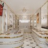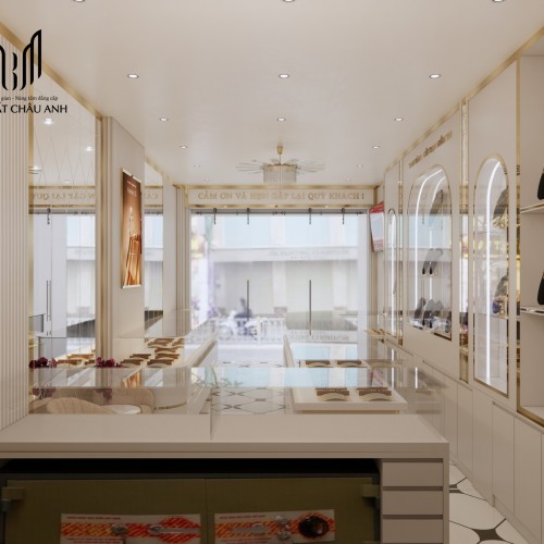 Ngay khi bước chân vào cửa, khách hàng sẽ lập tức cảm nhận được sự chỉn chu trong từng chi tiết thiết kế nội thất. Tông màu chủ đạo trắng vàng kim mang đến cảm giác tinh khôi, sạch sẽ nhưng không kém phần sang trọng. Lối đi trung tâm rộng rãi, hai bên là hệ thống tủ trưng bày được thiết kế uốn cong mềm mại, khéo léo dẫn lối khách hàng tham quan.