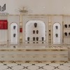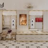 Hai bên vách là các hộc âm tường tích hợp kệ trưng bày dây chuyền được tạo hình vòm cung, mang đến cảm giác mềm mại và thời thượng. Khung vòm được viền chỉ vàng nhấn nhá, kết hợp ánh sáng hắt nhẹ từ bên trong giúp sản phẩm tỏa sáng một cách tự nhiên.