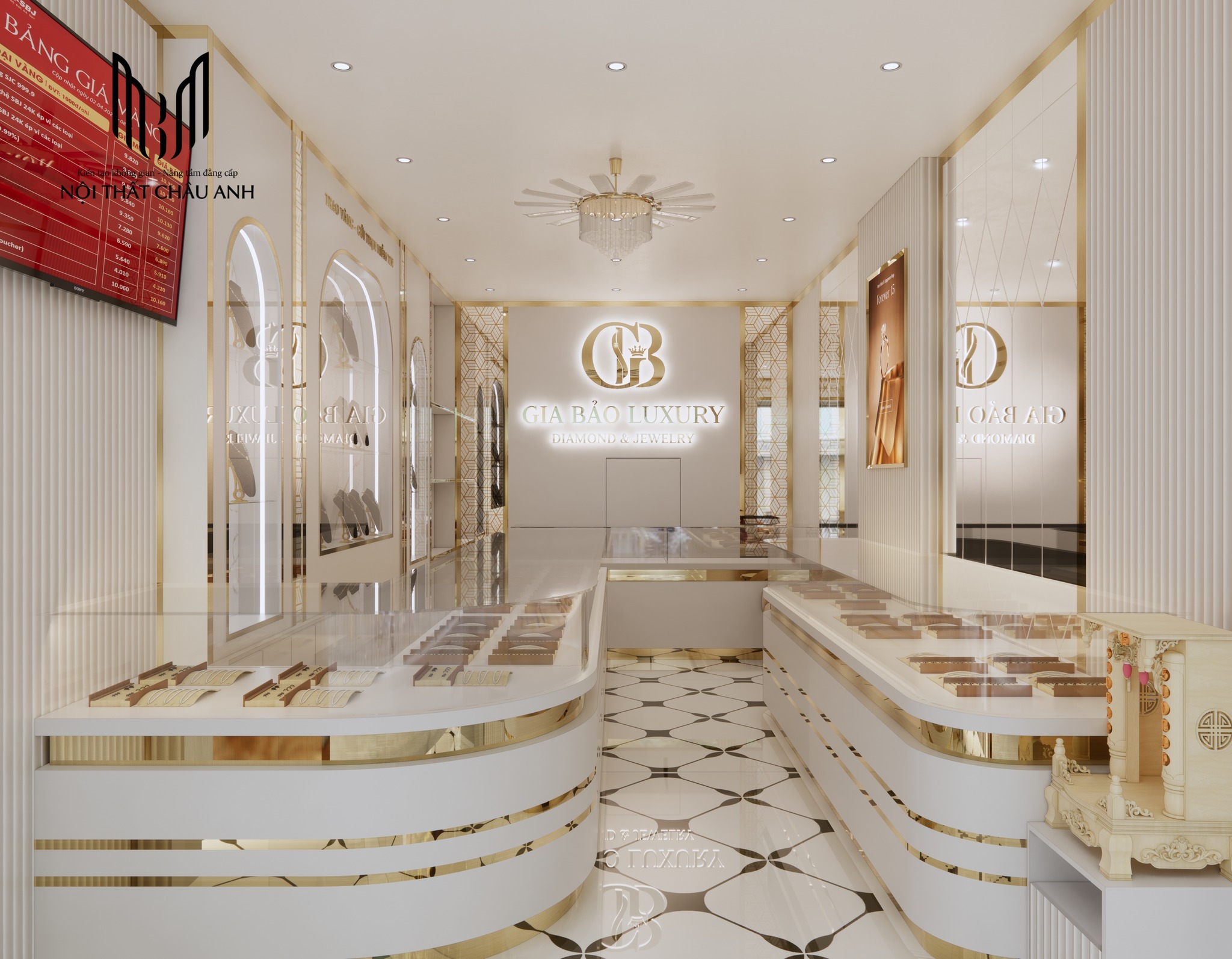 Không thể không nhắc đến vách logo trung tâm với bức vách trắng nổi bật có logo GB được cắt CNC ánh vàng sáng bóng, gắn lên nền tường với hiệu ứng đèn hắt sáng phía sau, tạo chiều sâu và cảm giác nổi khối mạnh mẽ. Dưới logo là dòng chữ “GIA BẢO LUXURY – Diamond & Jewelry” được bố trí ngay ngắn, cân đối và đầy tính thương hiệu.