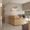 Ở cuối không gian là quầy lễ tân tiếp nhận thanh toán, xử lý thông tin và hỗ trợ khách. Khu vực này được thiết kế đơn giản, gọn gàng với quầy thu ngân đồng màu cùng hệ tủ trưng bày, đảm bảo sự thống nhất trong tổng thể.