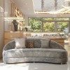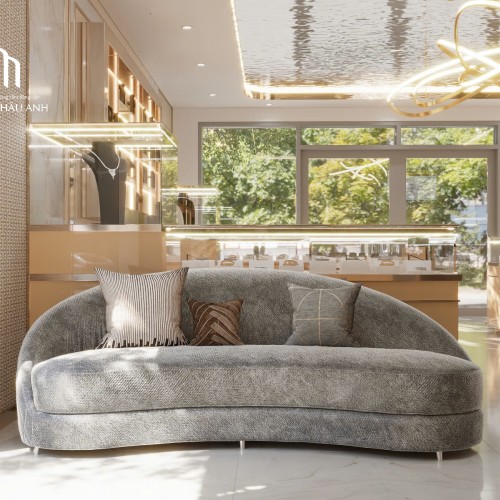 Một điểm đáng chú ý trong thiết kế nội thất của tiệm vàng Kim Anh là khu vực ghế ngồi tiếp khách, được bố trí sát tường, gần cửa sổ. Ghế sofa dáng cong, màu ghi trung tính tạo sự đối lập nhẹ với tông màu chủ đạo của quầy tủ để phân chia không gian mà không cần vách ngăn.