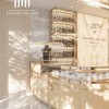 Việc xử lý ánh sáng vừa đảm bảo yếu tố thẩm mỹ, vừa có tác dụng tăng chiều sâu không gian, tạo cảm giác tiệm rộng hơn diện tích thực tế. Đèn trang trí ở trung tâm trần vừa là điểm nhấn, vừa phản chiếu xuống mặt kính tủ trưng bày, tạo hiệu ứng long lanh cho các sản phẩm bên dưới.