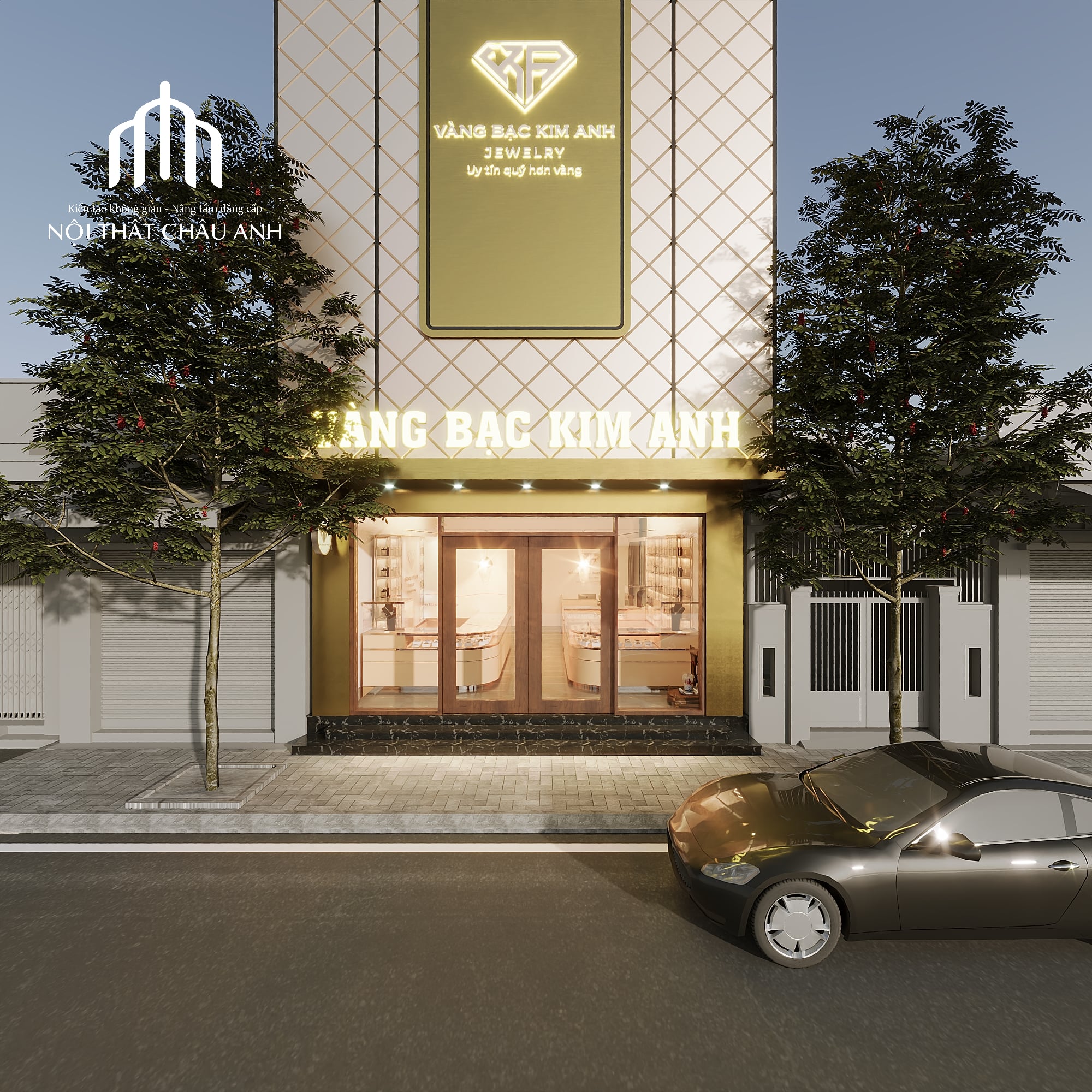 Tiệm vàng Kim Anh được đánh giá cao về cách tổ chức không gian thông minh. Từ mặt tiền đến bên trong, từng chi tiết đều được thiết kế đồng bộ, nhất quán về màu sắc, ánh sáng và vật liệu.