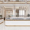 Các tủ trưng bày được bố trí theo hình chữ U và song song, tạo lối đi rộng rãi ở giữa cho khách hàng tham quan. Mỗi tủ đều có khay đựng được chia ngăn rõ ràng, giúp phân loại nhẫn, dây chuyền, vòng tay, bông tai… một cách khoa học. Điều này vừa giúp nhân viên dễ dàng giới thiệu sản phẩm, vừa giúp khách hàng nhanh chóng tìm được mẫu mã phù hợp.