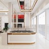 Không gian được chia thành hai khu vực chính: khu vực quầy trưng bày sản phẩm và khu vực bàn tư vấn, vách logo thương hiệu. Sự phân tách rõ ràng nhưng vẫn liền mạch, tạo trải nghiệm thuận tiện cho cả khách hàng và nhân viên.