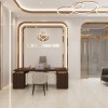 Bàn tư vấn sử dụng chất liệu gỗ nâu trầm sang trọng, mặt bàn phẳng, rộng rãi, vừa đủ để bày laptop, tài liệu và hộp trang sức khi cần thiết. Hai bên bàn được trang bị ghế bọc nệm êm ái, giúp khách hàng có trải nghiệm thoải mái khi ngồi lâu. Đặc biệt, vị trí bàn được đặt ngay trước vách logo thương hiệu, tạo sự trang trọng và tăng độ tin cậy cho khách hàng khi trao đổi.
