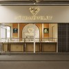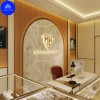 Trần và tường bên trong tiệm được ốp gỗ kết hợp với sơn màu kem nhạt, tạo nền trung tính giúp làm nổi bật ánh sáng từ trang sức. Bức tường phía sau logo thương hiệu được thiết kế dạng phù điêu hoa văn tinh tế, tạo điểm nhấn nghệ thuật và nâng tầm hình ảnh thương hiệu.