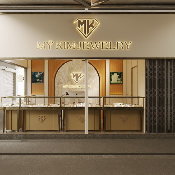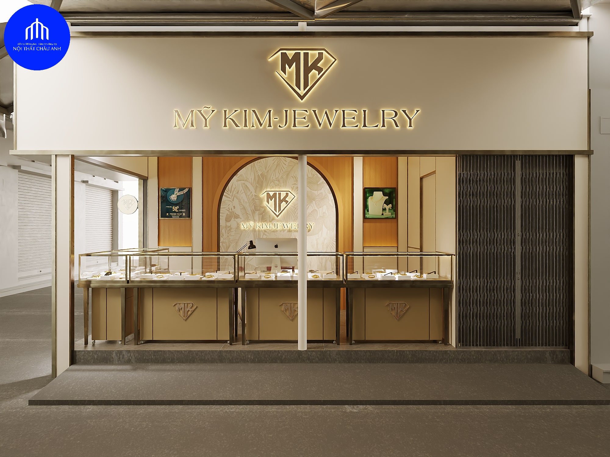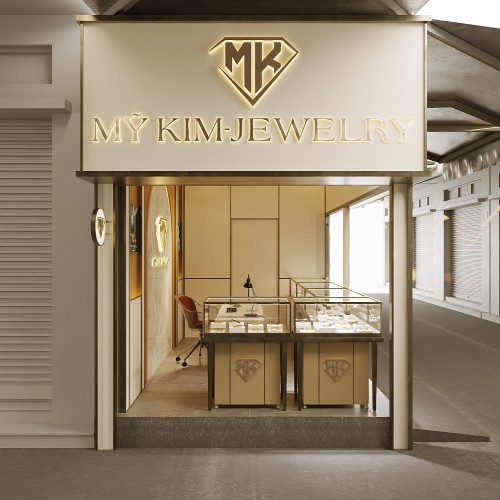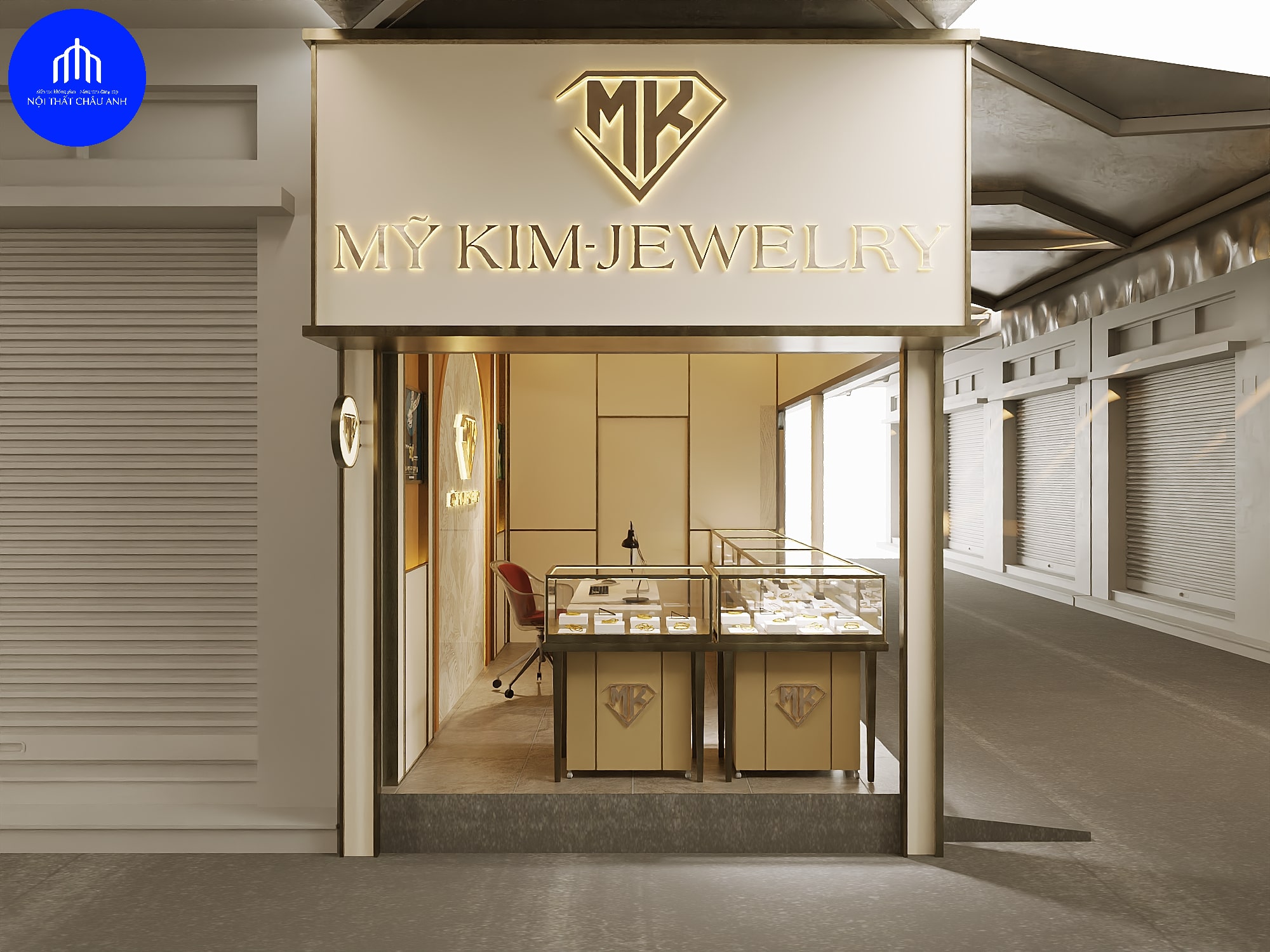 Mặt tiền tiệm vàng được xem như “bộ mặt thương hiệu” giúp thu hút khách hàng từ xa. Với diện tích nhỏ, mặt tiền được thiết kế tối giản nhưng vẫn toát lên sự sang trọng nhờ tông màu vàng kem chủ đạo kết hợp với ánh sáng đèn LED vàng ấm. Logo MK Jewelry được đặt nổi bật trên nền biển hiệu, đi kèm hiệu ứng ánh sáng giúp tăng khả năng nhận diện.