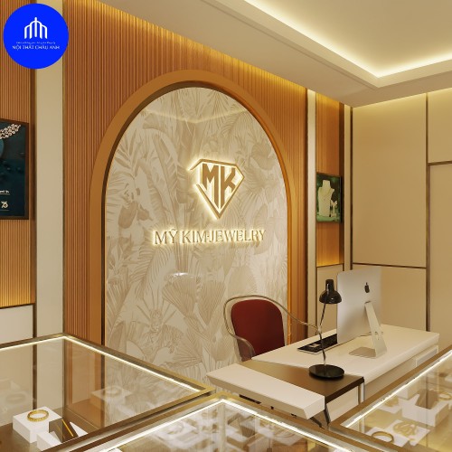 Tiệm vàng Mỹ Kim Jewelry được thiết kế theo phong cách hiện đại kết hợp sang trọng tối giản. Tông màu vàng kem chủ đạo không chỉ mang lại sự quý phái, mà còn gợi lên ý nghĩa tài lộc và thịnh vượng, phù hợp với lĩnh vực kinh doanh vàng bạc.