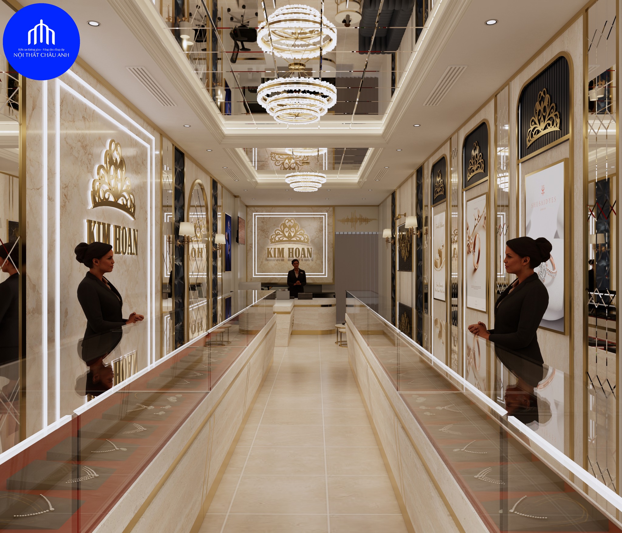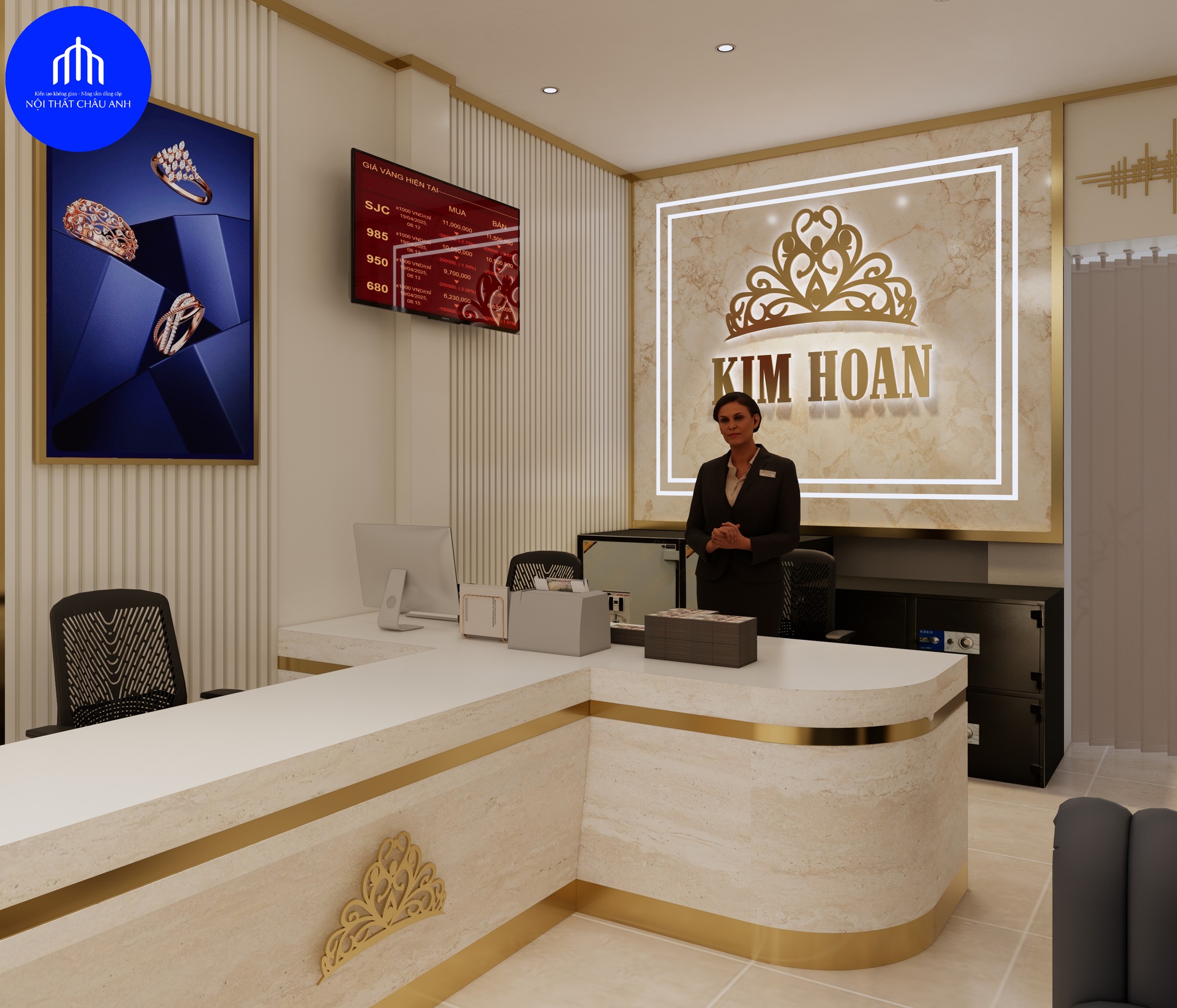 Cuối lối đi là khu vực lễ tân với tường backdrop thương hiệu “Kim Hoàn”. Đây là vị trí quan trọng vì là điểm dừng mắt cuối của khách. Phần tường được ốp đá kết hợp chỉ vàng giúp logo nổi bật và tạo cảm giác uy tín.