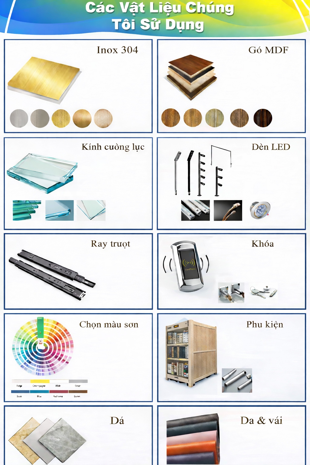 MDF, laminate, veneer, kim loại, kính cường lực, inox,…